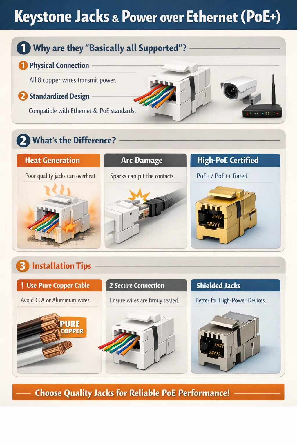 Formhór mór na gcónascairí cábla líonra caighdeánach ( Jacks Keystone ) tacú go fisiciúil le Cumhacht thar Ethernet (PoE), ach níl gach táirge chomh hiontaofa céanna faoi oibríocht ard-ualach iarbhír.