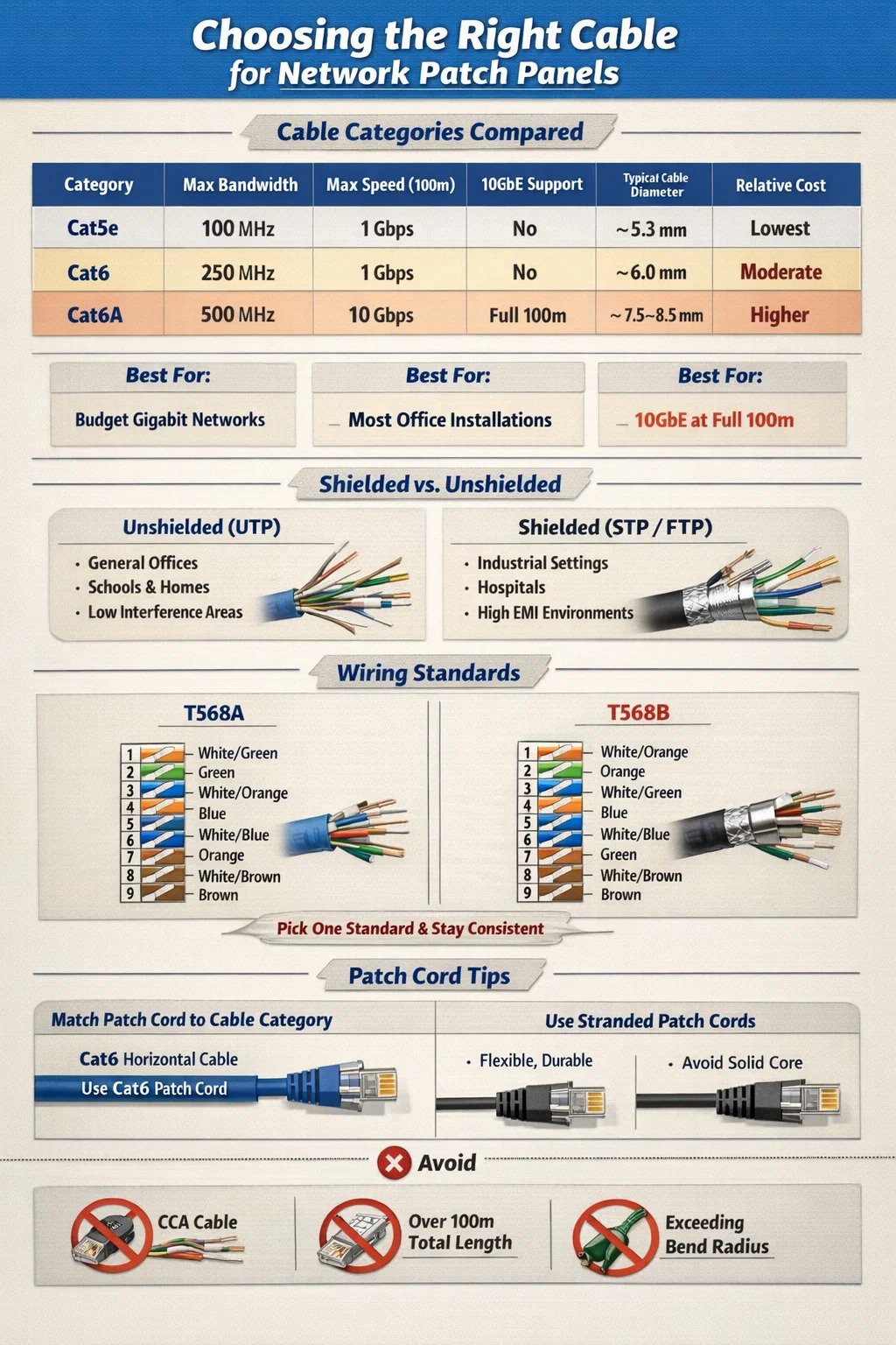 Nuair a thagann sé chun painéil paiste líonra , Is é cábla péire casta neamhshielded Cat6 (UTP) an rogha is coitianta a mholtar agus a imlonnaítear go forleathan don chuid is mó de thimpeallachtaí gnó agus líonra baile. Buaileann sé an chothromaíocht cheart idir feidhmíocht, costas, agus cosaint don todhchaí. É sin ráite, braitheann an cábla is fearr chun do phainéal paiste ar leith a shocrú ar do riachtanais luais, fad rite cábla, coinníollacha trasnaíochta agus buiséad. Tá Cat5e fós inmharthana go foirfe do líonraí gigabit ar bhuiséad teann, agus is é Cat6A an bealach chun suiteálacha 10GbE nó ionaid sonraí ard-dlúis.