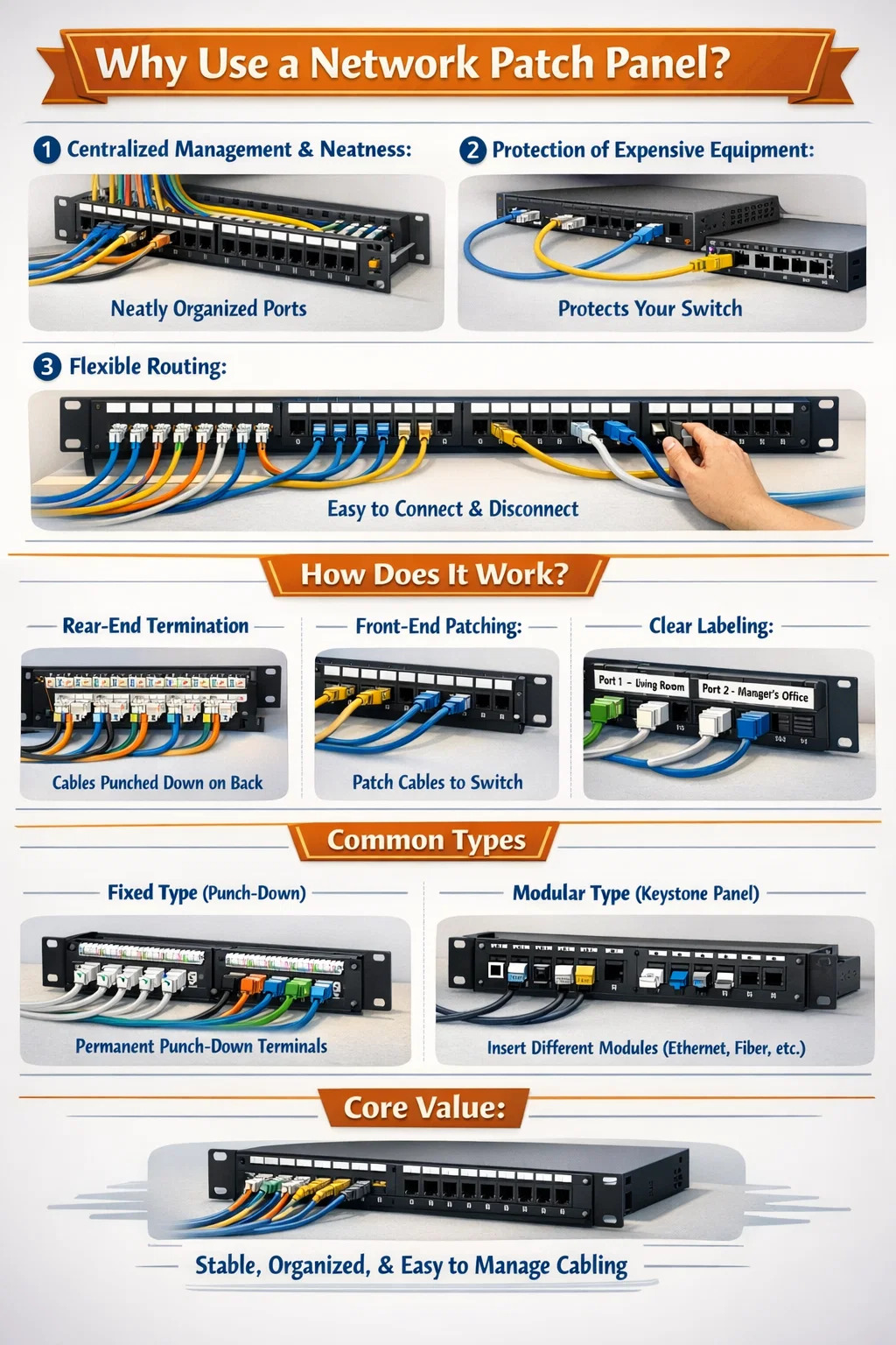 Samhlaigh an raibh cáblaí líonra agat ó 20 seomra ceangailte go díreach le lasc; má tangled na cáblaí, bheadh sé ina praiseach. Le painéal paiste líonra, tá na cáblaí fada go léir a thagann amach as na ballaí daingnithe go néata ar chúl an phainéil, agus tá sraith de chalafoirt eagraithe go néata ag an tosaigh.