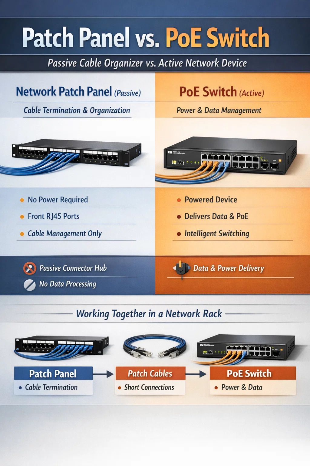 I suiteáil ghairmiúil, ní iomaitheoirí iad an dá cheann seo ach comhpháirtithe. Soláthraíonn an painéal paiste pointe tuirlingthe statach do gach sreang tógála, agus soláthraíonn an lasc PoE an nascacht agus an chumhacht is gá chun na sreanga sin a dhéanamh feidhmiúil le haghaidh feistí cosúil le ceamaraí IP, fóin VoIP, agus pointí rochtana gan sreang.