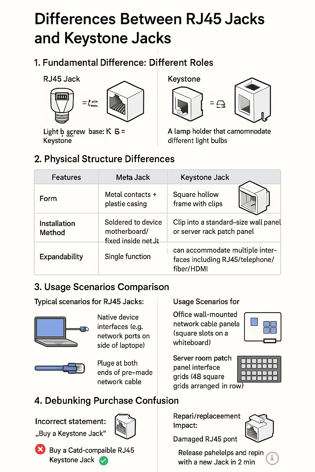 Keystone Jack: Fráma gléasta modúlach. Ní hé an comhéadan féin é, ach bonn plaisteach cearnach a úsáidtear chun RJ45 Jacks (nó comhéadain eile) a dhaingniú. Is féidir é a ghearradh isteach i bpainéil balla nó i bpainéil paiste cosúil le bloic thógála.