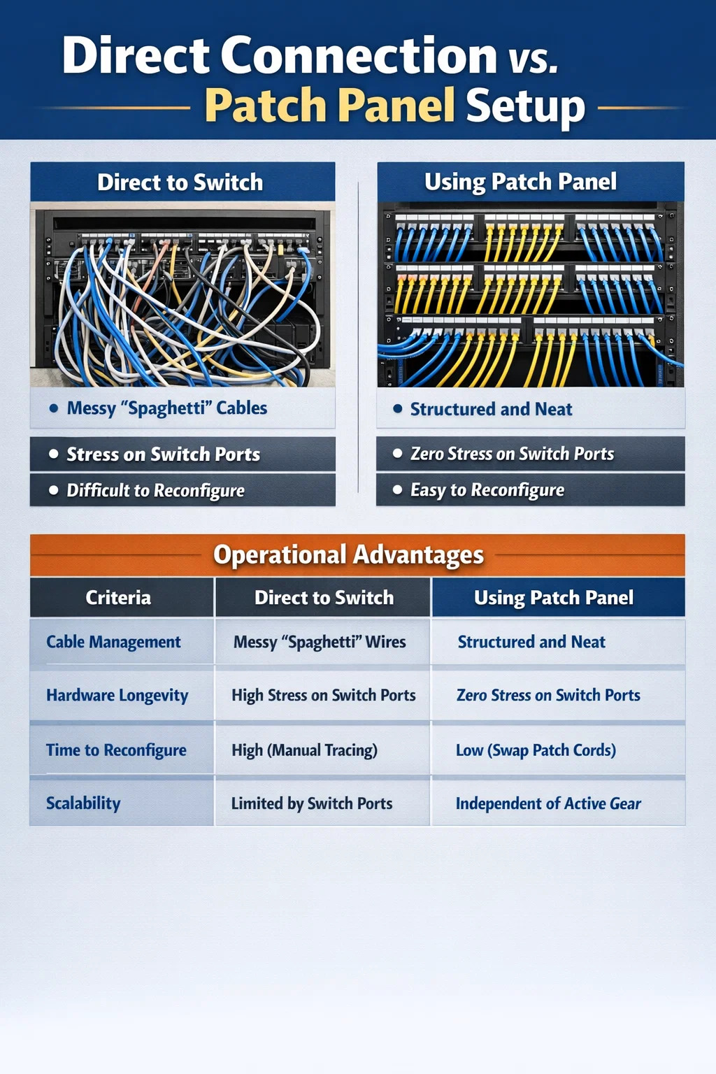 I ndeireadh na dála, íocann an "bac" a bhaineann le painéal paiste a shuiteáil as féin an chéad uair a chaithfidh tú píosa trealaimh a bhogadh, líne briste a aithint, nó luas do líonra a uasghrádú. Is sainmharc suiteáil ghairmiúil é a thugann tosaíocht d’iontaofacht thar aicearraí.